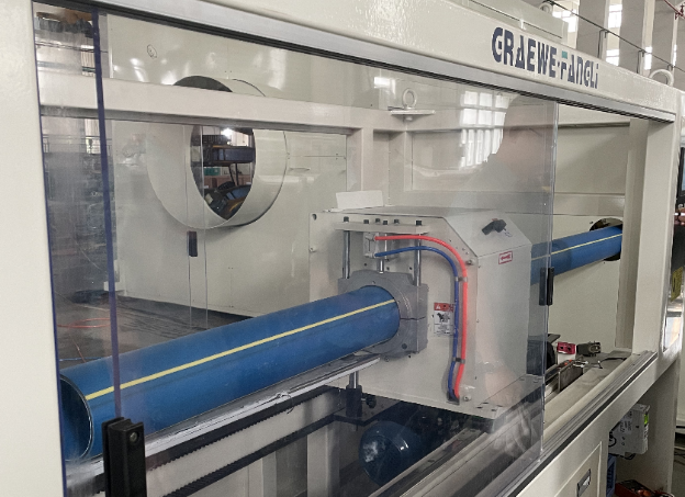 Ten vierde wordt de pijp door de rupstractie-eenheid getrokken en naar de snijder gestuurd waar de pijp wordt afgesneden volgens de vooraf ingestelde lengte; tegelijkertijd wordt het zaagstof door de stofafnemer verwijderd.